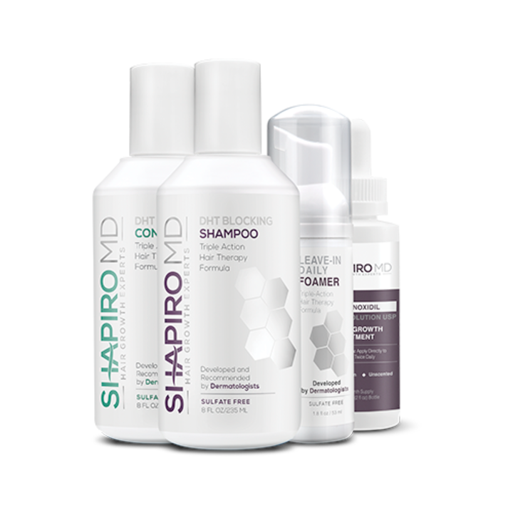 This regrowth system is a powerful, broad defense system for men dealing with hair loss, including the Shapiro MD DHT Fighting Shampoo, Conditioner, Leave-In Foamer, and the clinically proven power of our 5% Minoxidil Hair Regrowth Serum.
