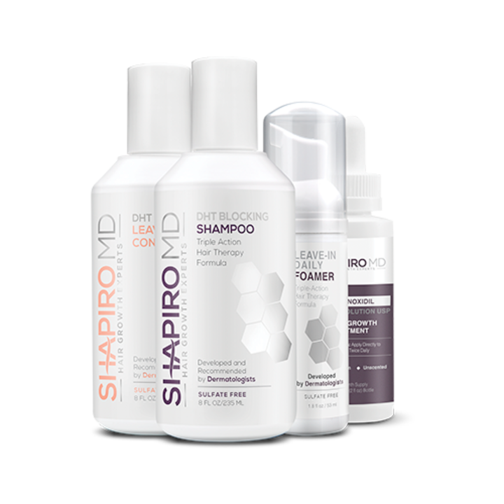 Support hair's natural growth cycle with this system of naturally-powered and medical-strength formulas. Our patented shampoo, conditioner, and leave-in foamer contain natural botanical compounds that have been shown to fight the effects of DHT, the hormone linked to hair loss. Additionally, these compounds are storehouses of antioxidents, which help minimize the damage caused by regular heat styling, extreme weather and other environmental stressors. This system also includes a serum containing 2% minoxidil, an ingredient that's been clinically proven to help women regrow hair. Available exclusively from Shapiro MD.